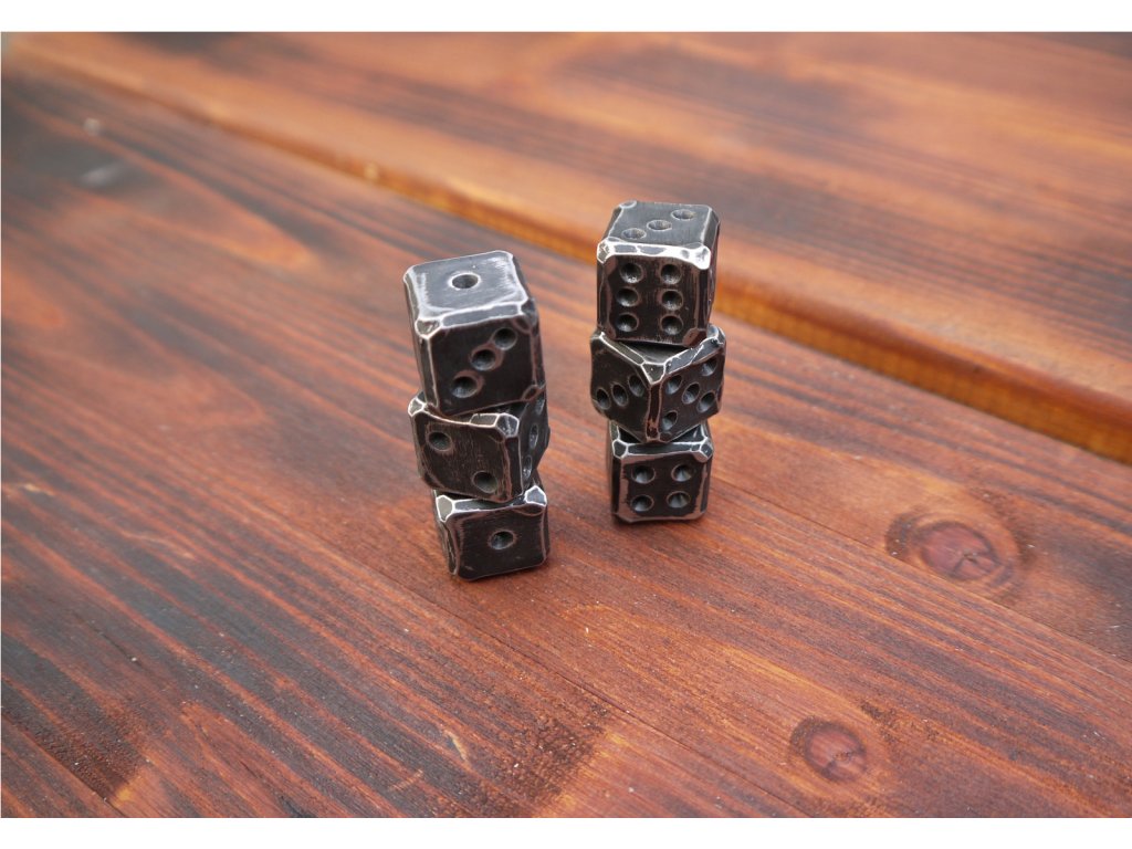 Masivní kované hrací kostky o rozměru 16x16 mm.
