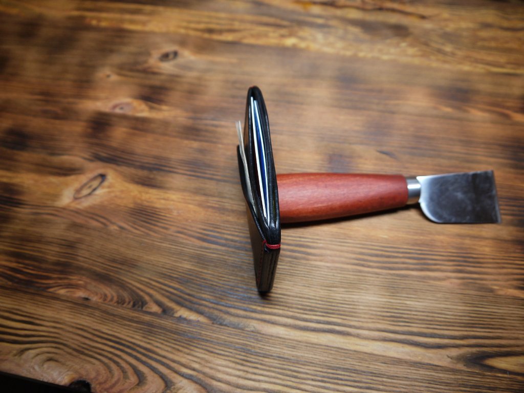 Peněženka je ručně vyrobená z kvalitní hovězí kůže, sešitá voskovanou nití průměru 1 milimetr